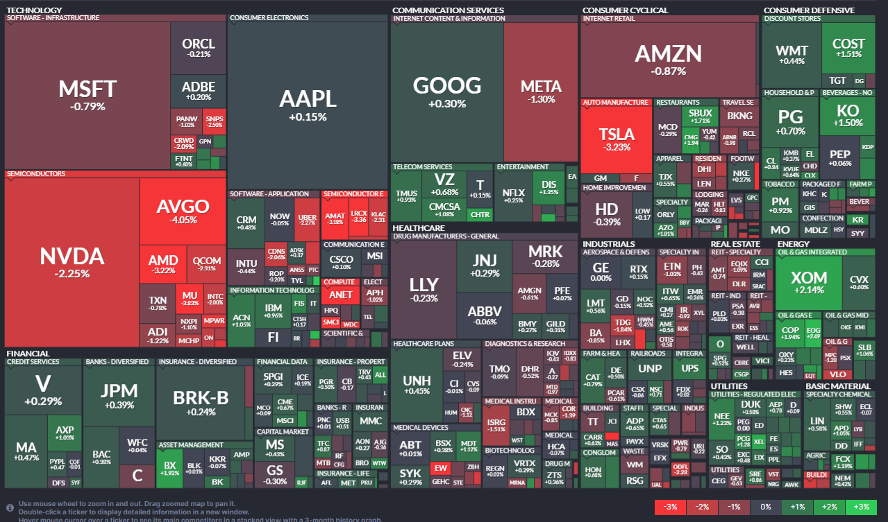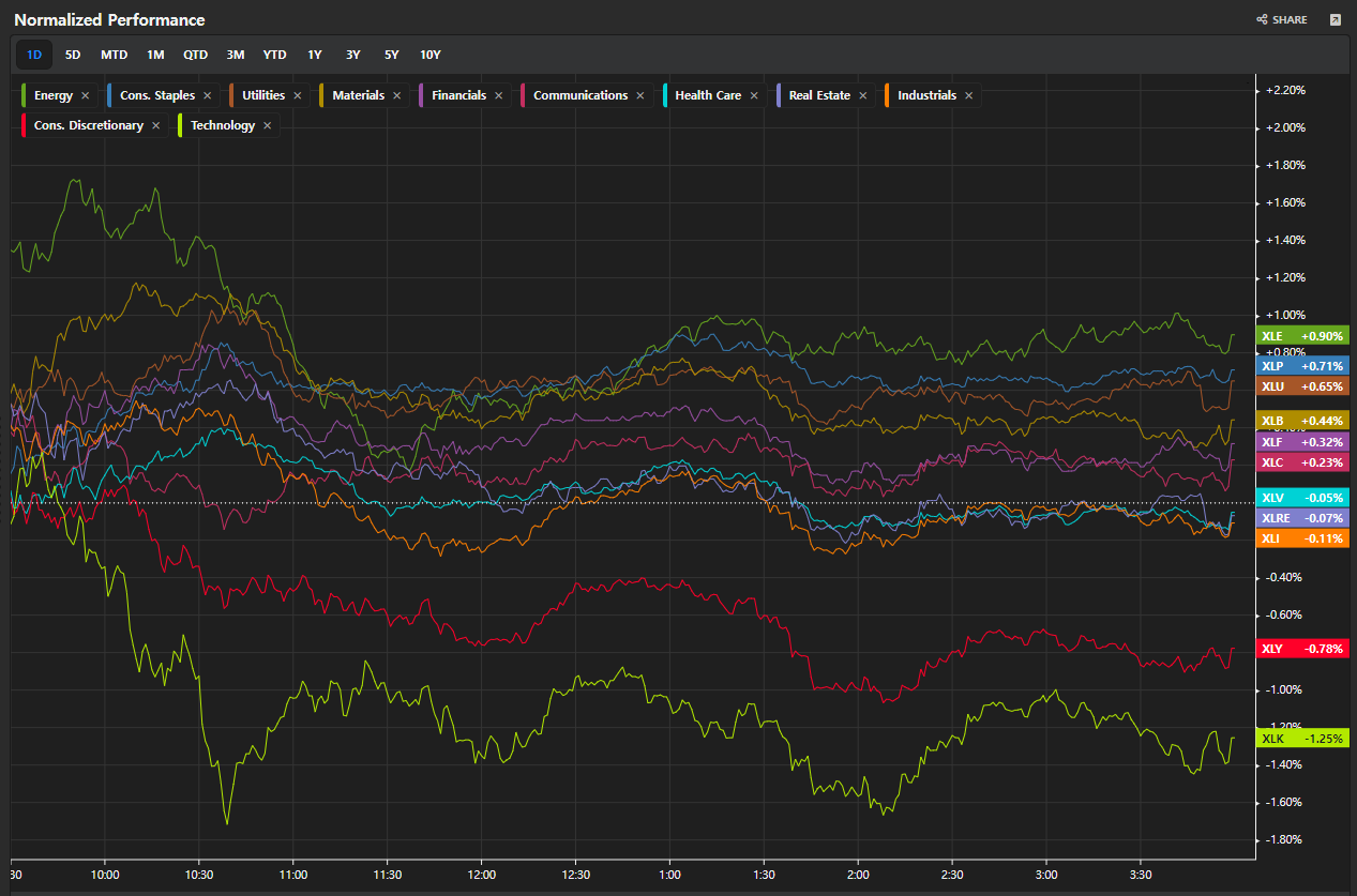 섹터별로 보면 [에너지 > 소비재 > 유틸리티 > 원자재 > 금융] 순으로 강세를 보였으며 [헬스케어]와 [부동산]의 경우 보합세를 보임, [테크]는 -1%대 급락함