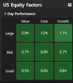 세부적으로 보면 [반도체 > 항공 > 태양광 > 홈빌더 > 러셀 > 리츠 > 지역은행] 순으로 상승
