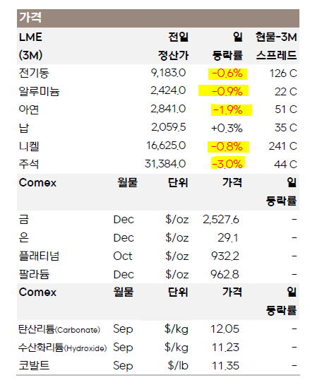 - [비철금속] 미국 시장이 노동절로 휴장한 가운데 전일 비철은 중국 제조업 활동 부진에 전반적으로 하락