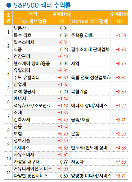 - 부동산을 제외한 10 개 섹터 모두 하락마감. 전일 장마감 후 발표된 브로드컴의 실적발표에서 기대치에 못미치는 가이던스가 발표된점이 반도체(SOX,4.5%)업종 전반에 부정적으로 작용. 빅테크들의 부진으로 컴스(-2.9%)가 가장 큰 하락세를 보였으며 테슬라(-8.5%) 또한 자동차업종(-7.6%)과 함께 경기 상황에 대한 우려를 반영