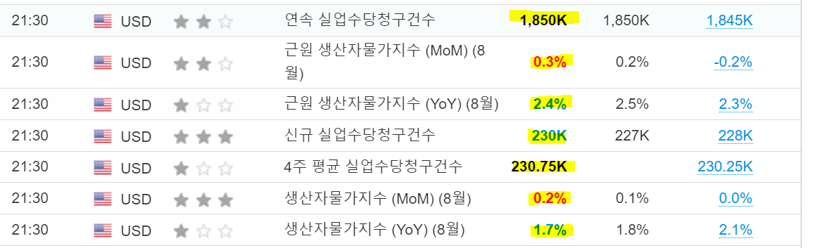단, [PPI와 CPI간 스프레드]는 긍정적, 8월 헤드라인 CPI는 2.5% 상승, 헤드라인 PPI는 2.4% 상승함. 2개월째 PPI-CPI 스프레드가 0.8%로 안정적으로 유지되고 있는데 이는 기업 마진이 괜찮을 것이란 이야기이고, 일반적으로 이 스프레드는 기어브이 강력한 마진과 관련성이 높으므로 기업들의 실적 훼손에 대한 우려를 잠재 울 수 있음주간실업수당청구 9월 1주 신규실업수당청구건수는 23 만명으로 집계되며 컨센과 전월 수치를 모두 상회. 다만 그 폭은 크지 않아 전일 후퇴했던 인하 기대감을 일부 회복시키는 수준의 영향력.