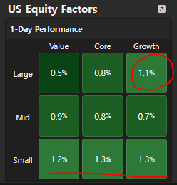 기업규모별로 보면 대형주에선 기술주 중심으로 강했지만, 중소형주는 전반적으로 강세를 보였는데, 이는 티미라오스의 기사에서 50bp에 대한 희망을 읽은 시장 참여자들이 금리 인하 수혜주로 눈을 돌렸기 때문으로 보임