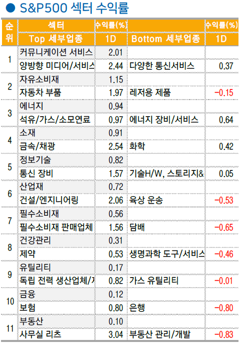 미 증시는 DOW +0.58%, S&P 500 +0.75%, NASDAQ +1.00%, Russell 2000 +1.29%로 상승 마감. 개장 전 발표된 ECB 의 25bp 예금금리 인하 결정과 경기지표들로(PPI, 신규실업수당청구) 전일 CPI 발표 이후 후퇴했던 빅컷 기대감이 일부 회복. 여기에 기술주 반등을 이끌어냈던 골드만삭스의 커뮤나코피아 2024 에 이어 금일 또한 백악관에서 열린 정부관료들과 AI 리더들(엔비디아, 마이크로소프트, 구글, OpenAI 의 CEO 들)의 회동에 테크 업종 전반의 긍정적 센티 확산.
