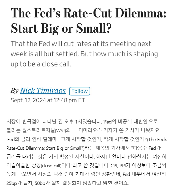 [9월 다시 불거진 미국 경기 침체 고조는 표면상의 이유]일 뿐, 간접적으로 미국 경기 침체가 고조되면 [9월 FOMC에서 연준이 빅컷을 단행하지 않을까하는 금융시장의 심리가 투영]됐다.