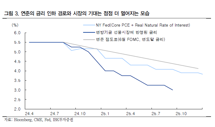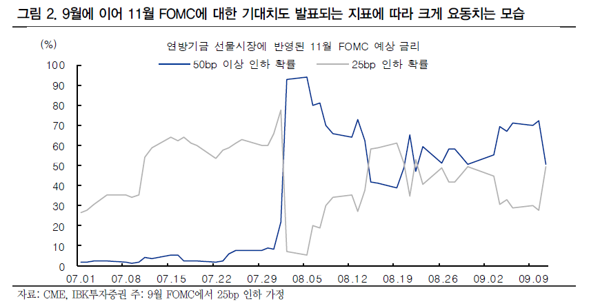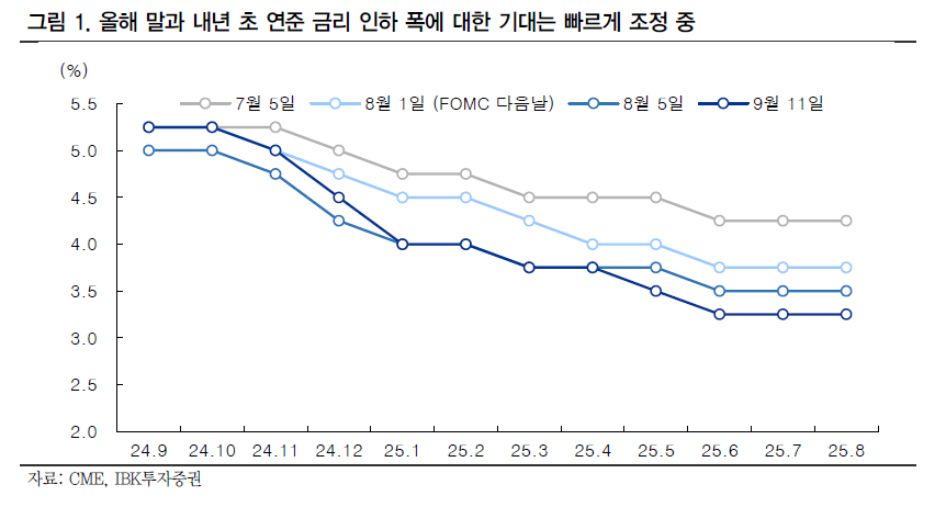 - FOMC에서 경기에 대한 과도한 우려가 완화되는지 여부가 중요하다. 최근 미국 경기에 대한 눈높이가 빠르게 내려왔으며 침체 우려도 끊임없이 대두되는 만큼, 인하가 정상화 차원의 조치라는 확신이 필요하다. 점도표를 통해 시장 기대와 연준이 제시할 경로의 격차를 좁히며 변동성이 확대될 가능성을 배제할 수 없다.
