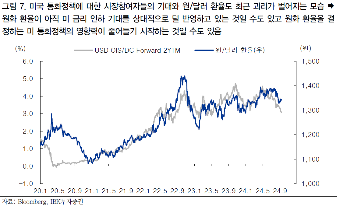 원화 환율이 아직 미 금리 인하 기대를 상대적으로 덜 반영하고있는 것일 수도 있고 원화 환율을 결정하는 미 통화정책의 영향력이 줄어들기 시작하는 것일 수도 있다.