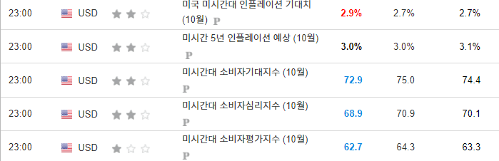 -미시간대 소비자심리지수], 10월 소비심리지수는 68.9pt 로 전월(70.1pt)비 하락하며 컨센(70.9pt) 하회. 미시간대는 기대 인플레이션이 완화됐지만 소비자들이 아직 높은 물가에 부담을 받고있음을 설명. 1Y 기대 인플레이션은 2.9%로 전월비(2.7%) 상승, 5 개월만에 상승세 전환하는 모습이나 아직 평균 범위 내 등락이란 평가로 영향력은 제한적