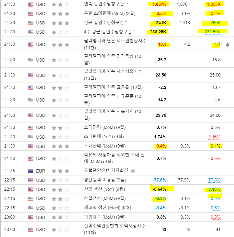 주간실업수당청구, 12일로 끝난 10월 2주차, 주간실업수당청구건수는 24.1 만명으로 전주보다 1.9 만명감소한 모습. 다만 직전주 수치는 2 천명 가량 상향조정. 연속수당청구건수는 186.7 만명으로 직전주 대비 9 천명 증가