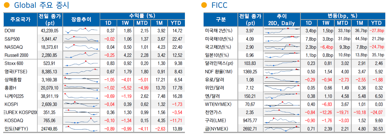미 국채 금리는 2Y 3.97%(+3.4bp), 10Y 4.09%(+7.8bp)로 상승하며 견조한 경기지표에 따른 인하 기대감 후퇴를 반영.CME FedWatch 상 11 월 동결 확률 전일 6.3%에서 34.7%로 급등했으며 연내 1 회 인하 기대감 또한 13.9%→26.1%로 상승.