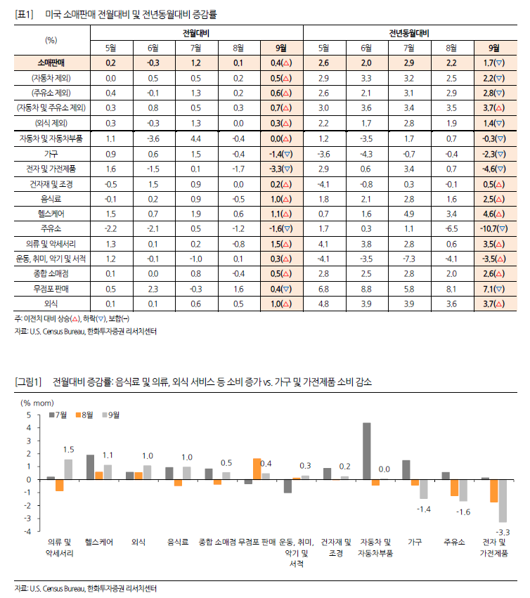 소매판매지수, 9월 소매판매는 전월비 0.4%MoM 상승하며 컨센(0.3%)을 상회, 8 월보다 상승폭을 확대하는 모습. 근원 수치도 +0.5%MoM 상승하며 컨센(+0.1%)을 크게 상회.