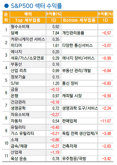 미 증시는 DOW -0.02%, S&P 500 -0.05%, NASDAQ +0.18%, Russell 2000 -0.37%로 혼조세 마감. 최근 대선 상황 반영되며 국채금리가 높은 수준을 유지한 상황. 다가오는 테슬라 및 빅테크 실적발표에 따른 우려감으로 상방도 제한된 모습. 이러한 상황 속 산업재, 소비재 대형주들이 대거 실적을 발표함에 따른 종목 장세 출현. 애플(-0.3%)과 엔비디아(-0.1%)와 달리 최근 횡보세 보이던 AI 빅테크 마이크로소프트(+2.1%), 메타(+1.2%), 알파벳(+0.7%)은 다음주 실적발표를 앞두고 간만의 강세를 기록 11 개 섹터 중 5 개 섹터 상승 마감했으며 필립모리스(+10.5%)호실적을 앞세운 필수소비재(+0.9%)가 가장 큰 폭의 상승.