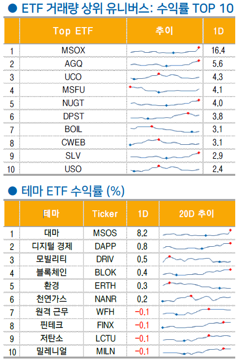 미 증시는 DOW -0.02%, S&P 500 -0.05%, NASDAQ +0.18%, Russell 2000 -0.37%로 혼조세 마감. 최근 대선 상황 반영되며 국채금리가 높은 수준을 유지한 상황. 다가오는 테슬라 및 빅테크 실적발표에 따른 우려감으로 상방도 제한된 모습. 이러한 상황 속 산업재, 소비재 대형주들이 대거 실적을 발표함에 따른 종목 장세 출현. 애플(-0.3%)과 엔비디아(-0.1%)와 달리 최근 횡보세 보이던 AI 빅테크 마이크로소프트(+2.1%), 메타(+1.2%), 알파벳(+0.7%)은 다음주 실적발표를 앞두고 간만의 강세를 기록 11 개 섹터 중 5 개 섹터 상승 마감했으며 필립모리스(+10.5%)호실적을 앞세운 필수소비재(+0.9%)가 가장 큰 폭의 상승.