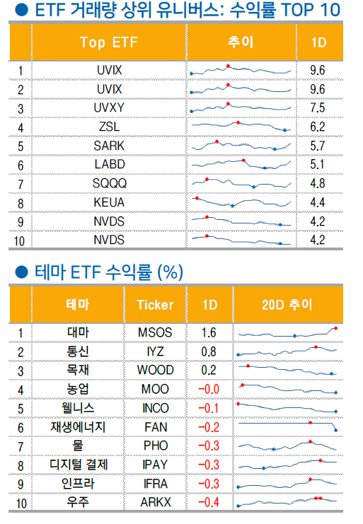 - 아날로그 칩 수요 회복에 힘입은 실적 공개. 중국 EV 시장 수요 개선도 실적 개선 요인으로 작용. 버티브 (-3.7%)는 전반적으로 견조한 실적 발표했으나, GPM 등 일부 요인에서 시장 실망감 자극. YTD 기준 수익률이 +140%대에 육박했던 만큼 시장 기대감 높았던 모습