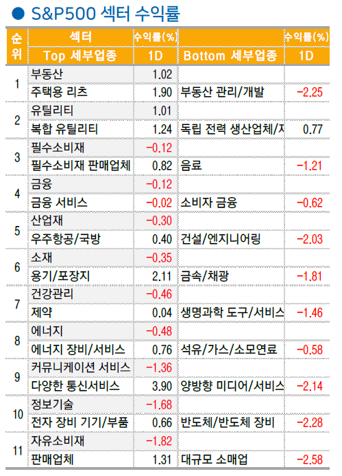 미 증시는 DOW -0.96%, S&P 500 -0.92%, NASDAQ -1.60%, Russell 2000 -0.91%로 하락 마감. 국채 금리 상승세 지속에 따른 증시 압박이 심화되는 가운데 애플(-2.2%), 엔비디아(-2.8%) 등이 개별 악재에 매물 출회되며 나스닥 급락.