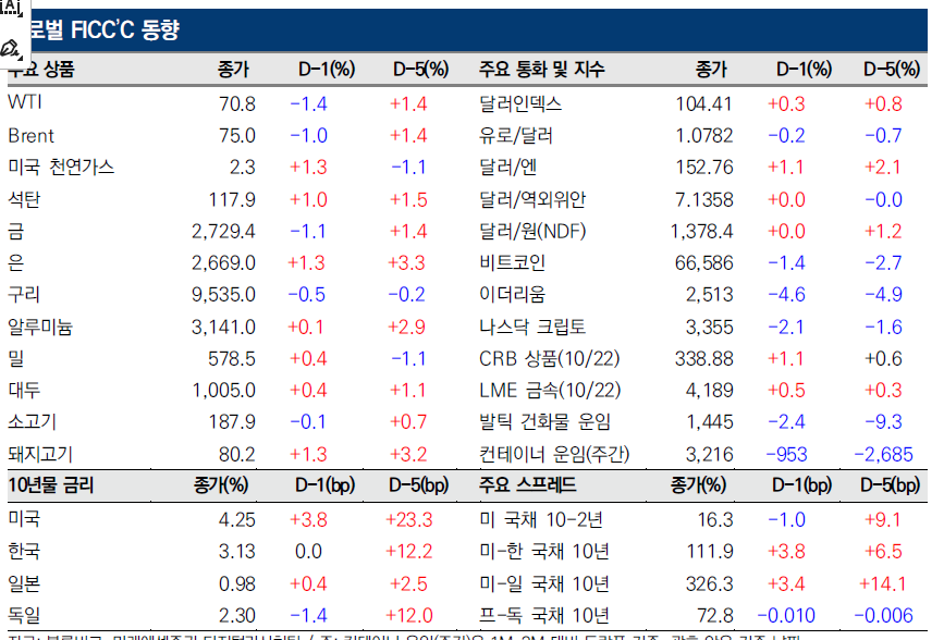 미 국채금리는 2Y 4.08%(+4.5bp), 10Y 4.25%(+3.8bp)로 트럼프 트레이드의 영향 지속. 20 년물 국채 입찰에서 수요가 부진했던 점 또한 금리를 자극.다만 9 월 주택지표 부진으로 상방을 제한되는 모습. 달러 인덱스(DXY)는 104.42로 상승했으며, 이는 미국의 강력한 채권 수익률과 연관되어 있음. 주요 통화와의 교환 비율에서 미 달러는 특히 엔 대비 강세를 보였음. 유가는 WTI 기준 -1.4% 하락한 $70.8 로 예상치를 상회한 원유재고 증가량을 반영하며 3 거래일만의 하락전환