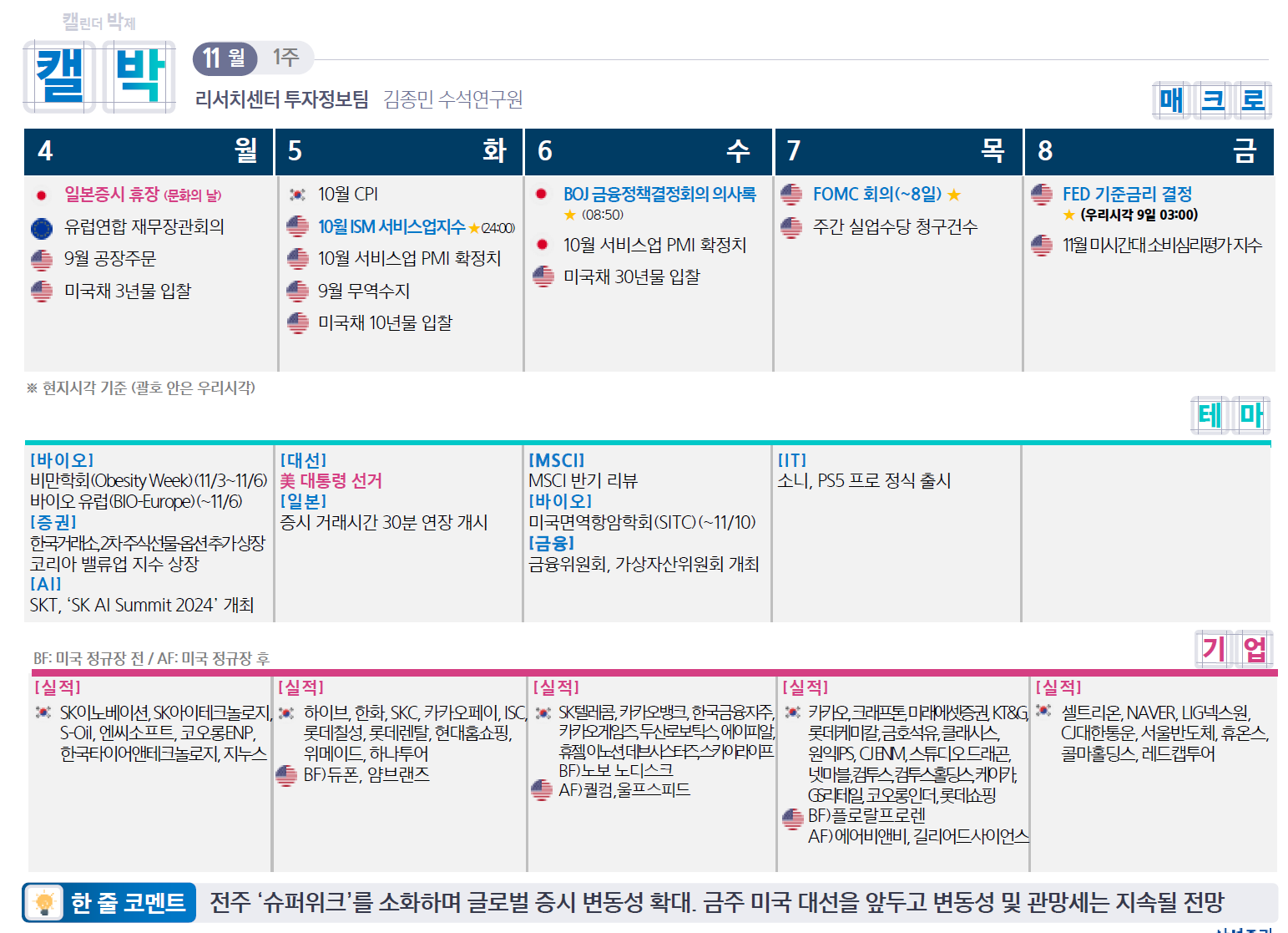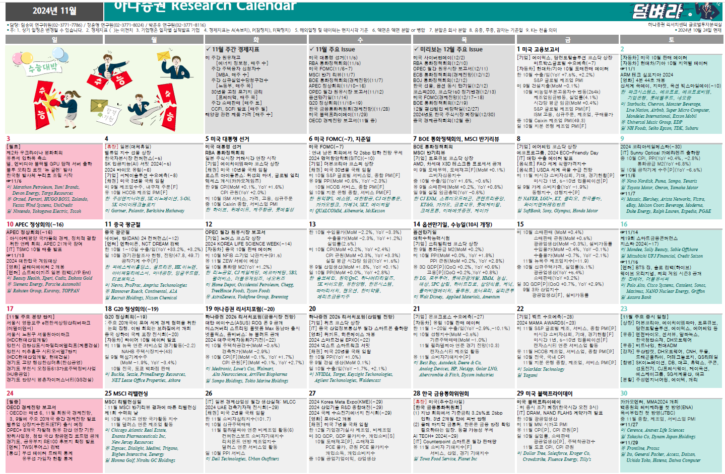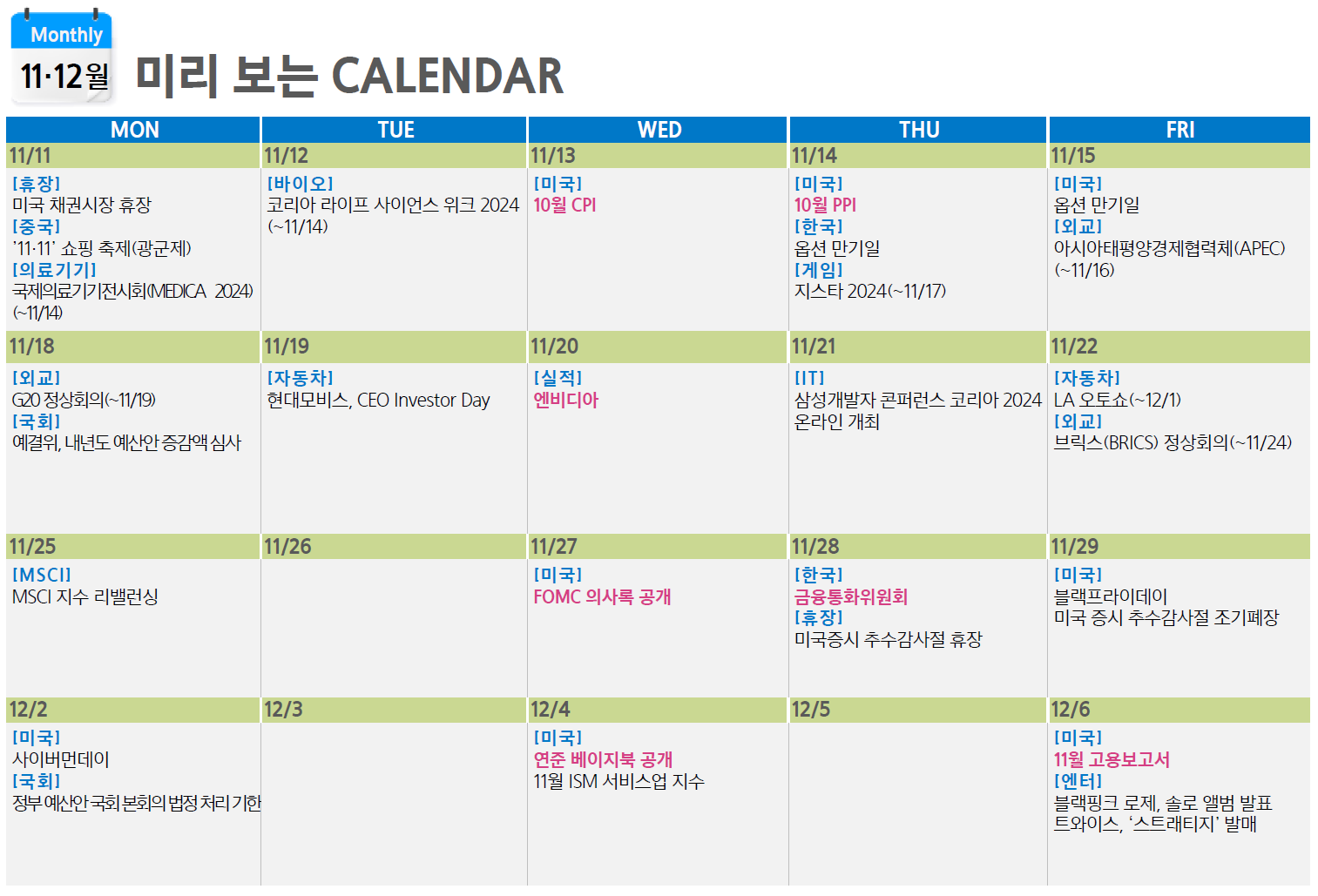 - 기타소식, 노스캐롤라이나, 조지아를 시작으로 스윙스테이트들을 장악해 나간 트럼프는 빠르게 대선 승리를 확정하며 상원 장악 소식 이후 승리 연설을 진행. 아직 하원 결과가 남아있으나 블룸버그 기준 공화당 204 석, 민주당 186 석 확보한 가운데 베팅사이트들은 공화당 집권 확률을 90% 이상으로 보고 있음. 현재 남아있는 경합 주들 중 50%가 공화당 우세인 면도 레드 스윕 가능성을 높이는 요인. 대선 승리 소식 이후 여러 국가 정상들의 축하 메시지가 이어지고 있음. 지정학적으로 시장의 귀추가 주목되는 지역은 역시나 푸틴과 시진핑의 메시지. 푸틴이 비공식적 루트로 메시지를 전달했단 외신 소식통의 정보 존재. 트럼프는 러-우 전황에 대해 푸틴 우호적인 방향성 제시한 바 있음. 이러한 언론의 집중은 향후 스트롱맨이라 불리는 정상들의 대결 역시 트럼프 정부 아래 격화 될 것을 시사