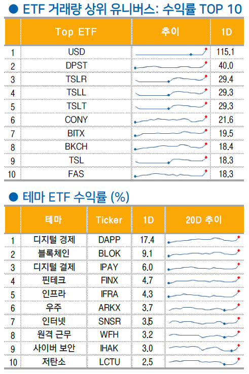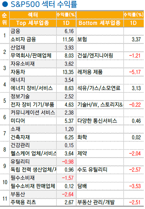 정규시장에서도 흐름을 유지하며 트럼프 트레이드는 극으로 치닫는 모습. 테슬라(+14.8%)와 JP 모건(+11.5%)이 대형주들 중 가장 뚜렷한 강세를 보이며 그간의 일론 머스크의 노력에 따른 보상과 금융 규제 완화를 기대하는 시장을 대변. 중소형주 중심의 [러셀지수]는 [트럼프 정부의 법인세 인하]와 [높아질 무역 장벽에 따른 자국 산업 보호 기대감]이 반영되며 +6%에 가까운 급등. 11 개 섹터 중 유틸리티, 필수소비재, 부동산 등을 제외한 8 개 섹터 상승 마감. 섹터 전체가 강세를 보였던 금융(+6.2%)의 급등이 두드러졌으며 산업재(+3.9%)는 인프라 투자 확대와 방산 기대감에 강세