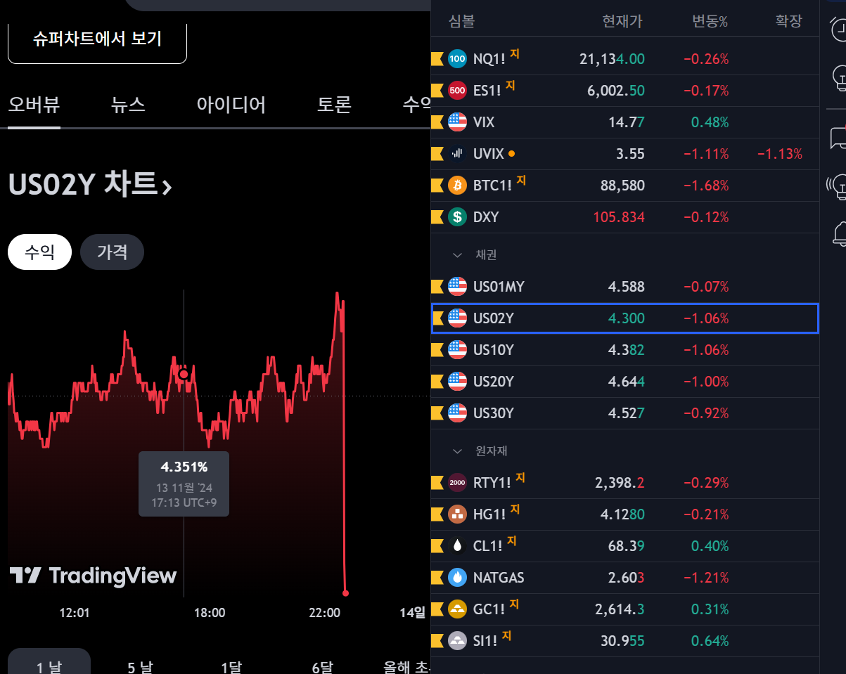 미 국채 금리는 2Y 4.29%(-5.4bp), 10Y 4.45%(+2.4bp)로 물가 발표 이후 장단기 금리 모두 하락했으나 장기금리는 무살렘, 로건 총재의 경계발언과 [공화당 레드 스윕 확정 소식에 상승].유가는 WTI 기준 -0.09% 하락한 $68.1 로 중동 언론이 [트럼프 집권 이후 이란이 협상 개시 의사]를 드러내며 이스라엘 보복 연기 결정을 내렸다고 보도한 점을 반영