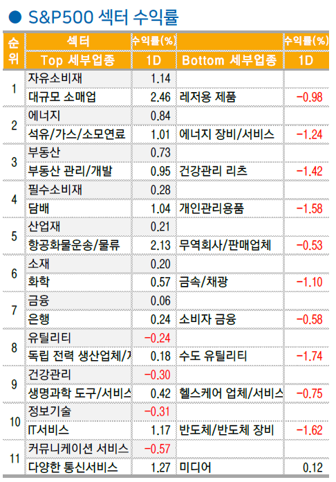 11 개 섹터 중 7 개가 상승 마감. 연말 소비시즌 기대감에 따른 아마존(+2.5%)이 경기소비재(+1.1%)를 견인했으며, 에너지(+0.8%), 부동산(+0.7%), 필수소비재(+0.3%) 등 강세