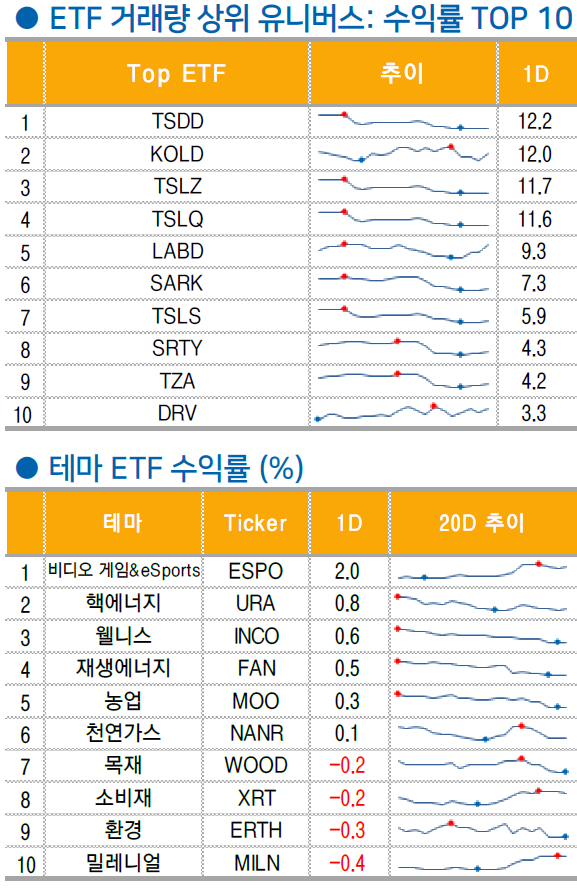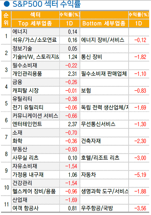미 증시는 DOW -0.47%, S&P 500 -0.60%, NASDAQ -0.64%, Russell 2000 -1.37%로 하락마감. 트럼프 트레이드의 되돌림 지속되는 가운데 테슬라(-5.8), 산업재(-1.7%), 러셀 등이 하락. 트럼프와 일론 머스크의 정부 효울화부의 주 감축 타겟이 국방 분야가 될 것이란 우려에 우주항공/국방(-3.6%)의 약세가 두드러짐.