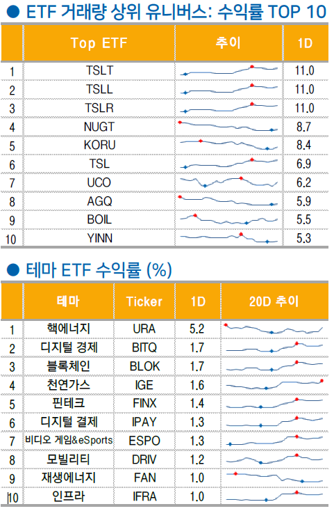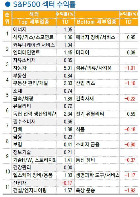 11 개 섹터 중 산업재를 제외한 10 개 섹터 상승 마감. 에너지, 경기소비재와 주택시장지수 회복세를 반영하며 상승한 부동산(+0.8%) 등이 견조한 모습.