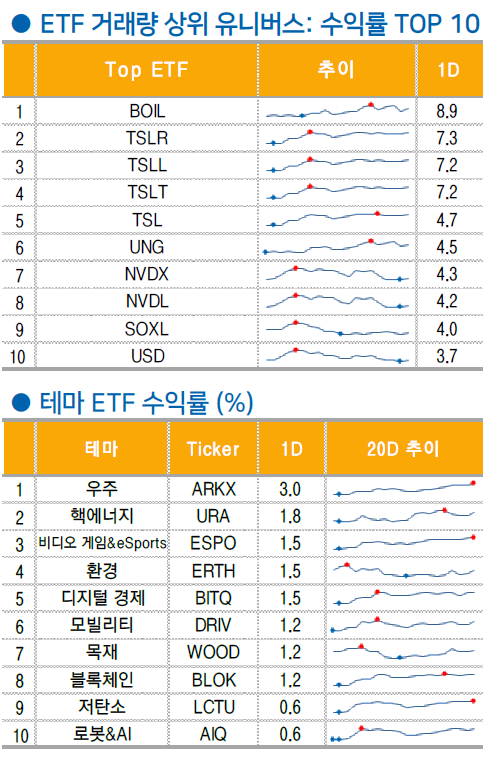 견조한 시장 환경 속 트럼프 트레이드 피해 종목들의 낙폭 과대 인식도 확산되며 퍼스트솔라(FSLR +3.5%)를 비롯한 태양광(TAN,+0.8%), 및 재생에너지(ICLN, +0.3%) 등도 상승
