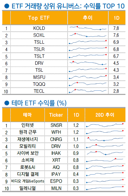 퍼스트솔라 (FSLR): 전일 4.3% 상승. 미 상무부가 동남아시아산 태양광 제품에 최대 271%의 반덤핑 관세를 부과하는 예비 결정을 내렸다는 보도에 지난주 금요일부터 상승세 지속.