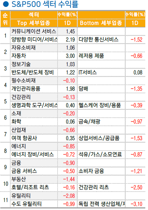S&P500 기업 중 320 개 기업이 하락 마감했으며 11 개 섹터에서 대형 기술주들이 속한 컴스, 경기소비재, IT 를 제외한 8 개 섹터가 하락 마감. 특히 금리에 민감한 부동산(-1.4%), 유틸리티(-2.1%) 업종이 하락. 반면 메타(META +3.2%), 아마존(AMZN +1.4%), 테슬라(TSLA+3.5%) 등의 M7 을 비롯한 [대형 기술주들은 견조한 모습]으로 나스닥 중심의 강세를 견인.