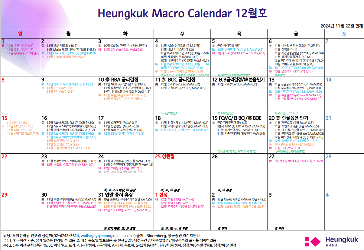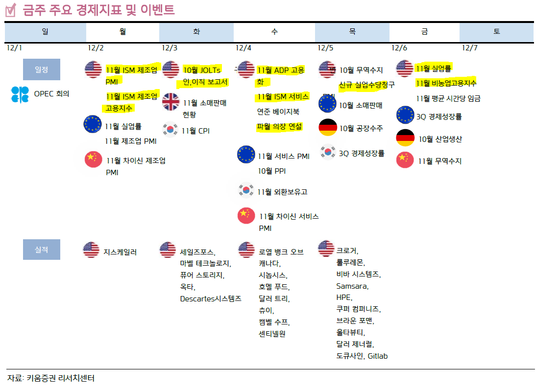 ISM 비제조업구매자지수, 11 월 ISM 비제조업 PMI 는 52.1pt 로 [확장세는 유지]했으나 컨센(55.5pt)을 큰 폭으로 하회. 전월(56pt) 대비로도 둔화된 모습. 신규주문이 53.7pt 로 3.7pt 가량 하락하며 부진을 주도. 이외 기업활동, 고용, 가격 등 대부분의 하위 지표들 역시 확장세는 유지했으나 하락하는 모습 연준의 기업 동향 보고서(베이지북)에선 성장에 대한 기대가 대부분의 지역과 업종에 걸쳐 완만하게 상승했다고 평가. 또한 향후 몇 달간 수요에 대한 기업들의 낙관을 조명. 소비 지출 부문도 일반적으로 안정화 됐음을 강조