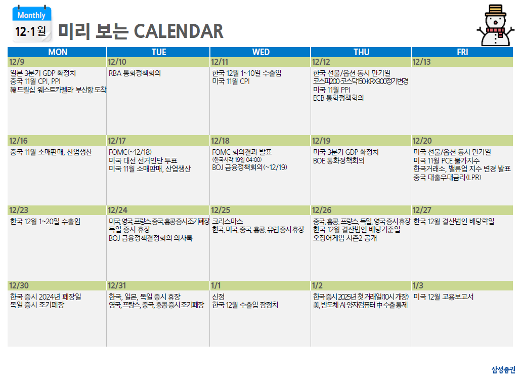 미 국채 금리는 2Y 4.13%(-5.2bp), 10Y 4.18%(-4.2bp) 로 하락. 장초반 한국 계엄령 사태가 진정됨에 따라 상승 출발하였으나 부진한 경기지표 반영하며 하락전환.이후 프랑스 정부의 불신임안이 가결되며 62 년만의 내각 해산이 결정. 안전자산 선호에 따른 국채가 상승으로 금리는 낙폭을 확대
