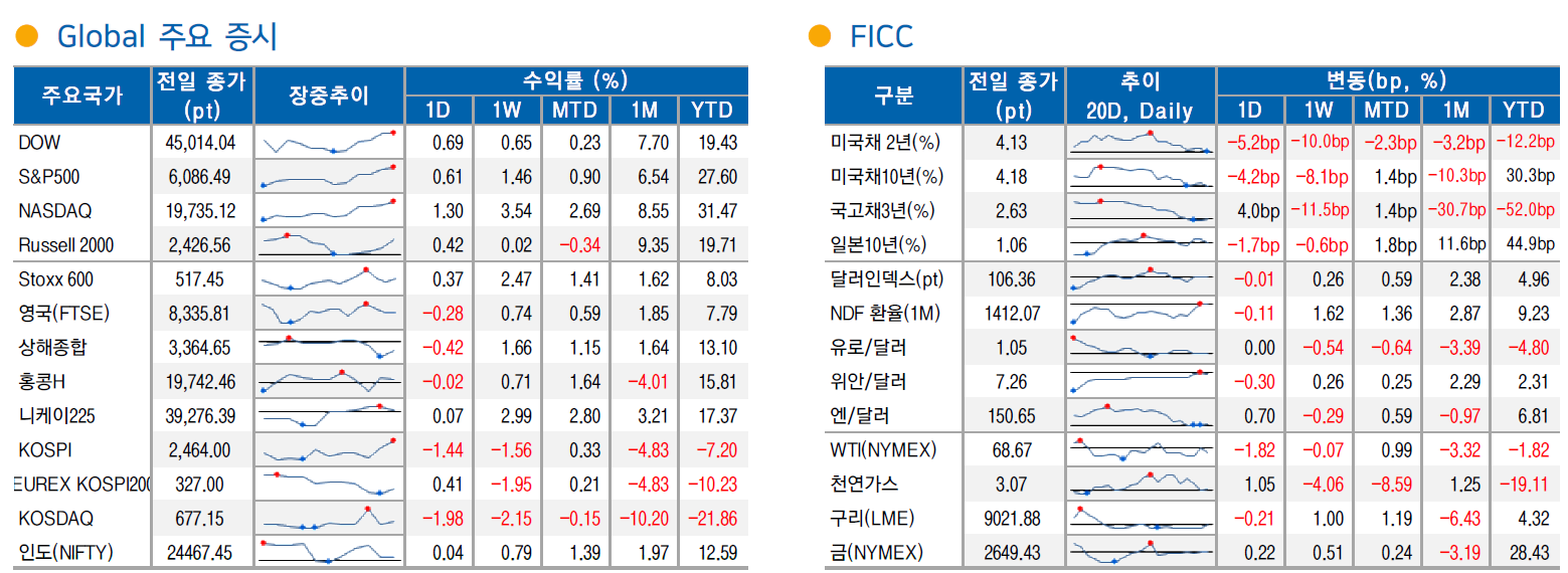 전일 장 마감 후 3FQ25 실적 발표. 매출 $1.52B, EPS $0.43로 컨센 상회. 강력한 실적과 긍정적 가이던스 등에 힘입어 주가 급등하며 나스닥 상승을 견인. CEO는 3FQ의 기록적인 실적은 현재 양산 중인 맞춤형 AI 실리콘 프로그램에 기인한 것이라 강조.