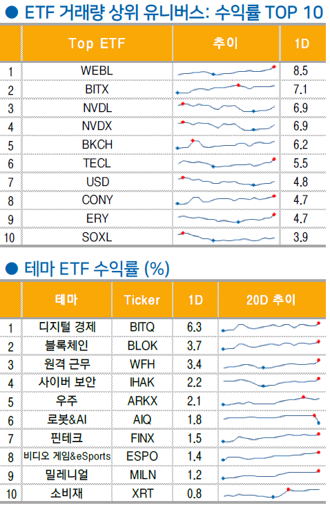 → 로켓랩(RKLB +0.4%), 데스티니 테크100(DXYZ +9.3%) : 민간인 사상 최초 우주 유영에 성공한 억만장자 재러드 아이작이 NASA 수장으로 지목됨. 아이작은 일론 머스크의 측근으로 알려져 있어 머스크의 우주사업에 동력으로 작용할 것이란 전망으로 SPACEX 에 대한 기대감 속 테슬라 뿐만 아니라 우주 관련 섹터 상승