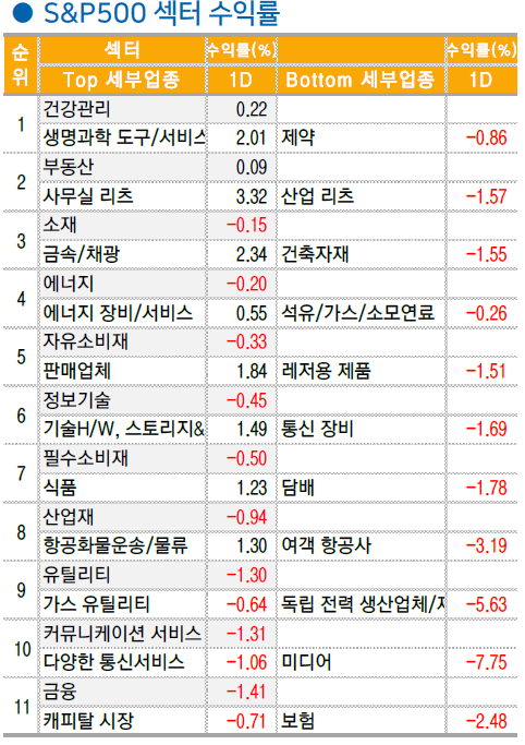 중국 경기 부양책에 대한 기대감으로 전일 항셍지수가 +2.8% 급등. 미 증시에서도 미국 상장 중국기업 ETF 인 PGJ 가 +8.6% 급등했지만 소재(-0.2%)와 에너지(-0.2%) 섹터가 지수 대비 소폭 아웃퍼폼한 것을 제외하면 미 증시 자체에 대한 영향력은 제한적인 모습