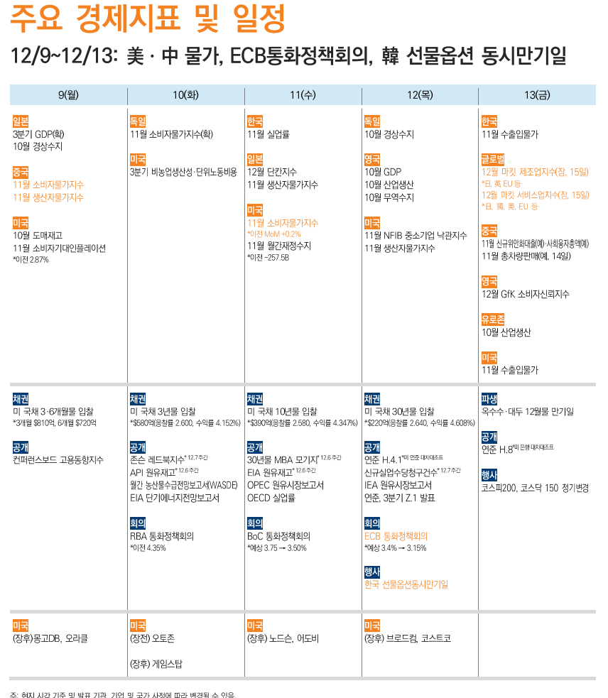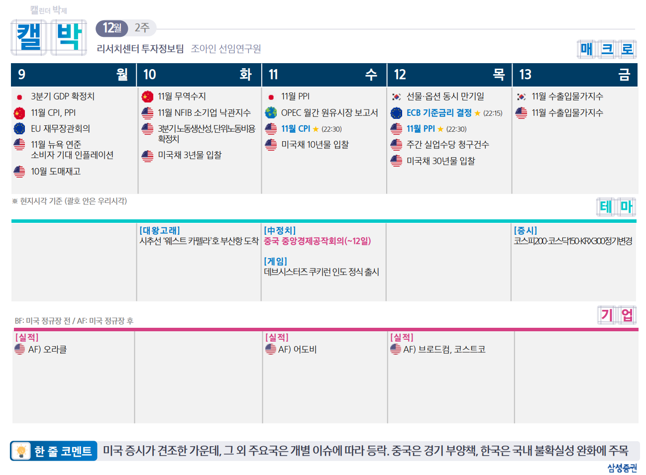 미 증시는 DOW -0.53%, S&P 500 -0.54%, NASDAQ -0.66%, Russell 2000 -0.42%로 하락마감. 12 월 FOMC 를 앞두고 [최근 발표된 고용, 물가 지표들이 견조한 모습을 보였음에도 상승랠리를 이어갔던 것에 대한 부담]감이 반영.