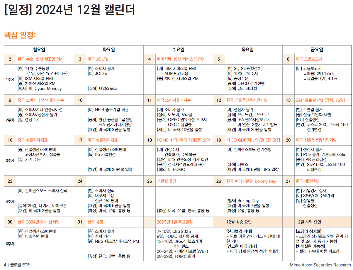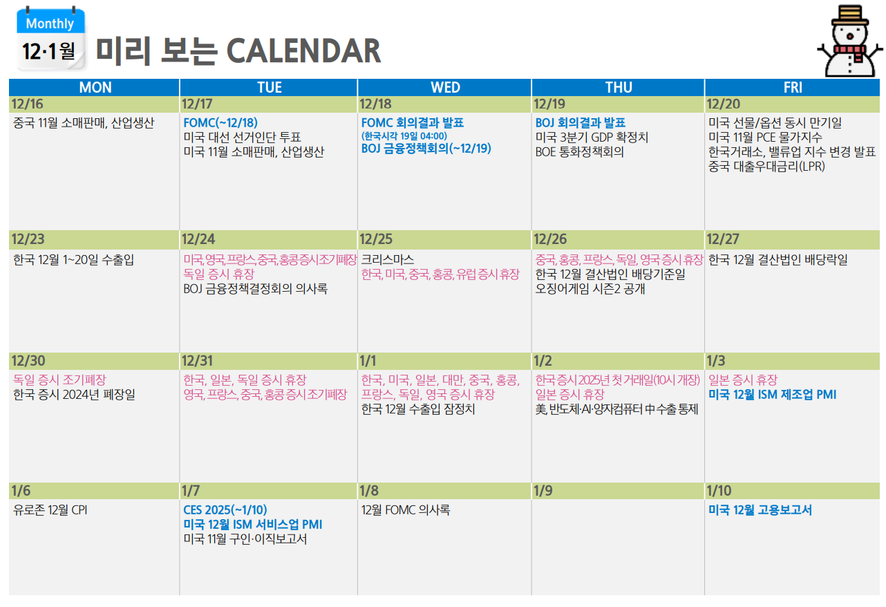 - ECB, 12 월 ECB 통화정책회의 이후 유로존 주요 정책금리를 25bp 씩 인하하기로 결정. 예금금리 기준 3.25%→3.00%로 인하. 경제 성장 전망에서도 하향조정이 이뤄짐. 올해 유로존 성장률은 0.8%YoY→7%YoY, 내년 성장률은 1.3%YoY→1.1%YoY 로 하향. 라가르드 총재는 [성장리스크가 하방으로 더 치우쳐 있다라고 우려]를 표시. 기업들은 불확실성에 투자를 보류하고 있으며 최신 지표들은 모멘텀이 둔화하고 있음을 강조. 더해 [이번 경제 전망에서는 트럼프 행정부의 무역 및 관세 영향을 완전히 반영하지는 않았다]고 덧붙였고 50bp 인하를 검토하는 일부 논의가 있었음을 언급하며 우려 가중
