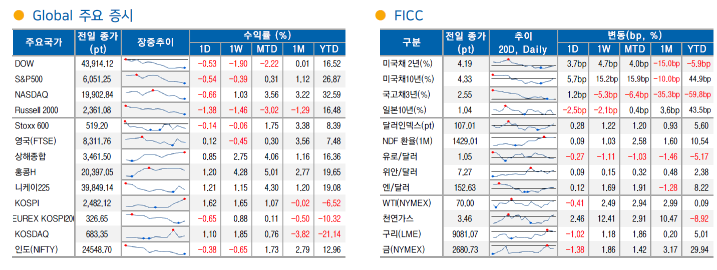 미 국채 금리는 2Y 4.19%(+3.7bp), 10Y 4.33%(+5.7bp)로 상승. 장초반 실업수당청구건수 반영하며 하락 출발했으나 이후 물가 지표 경계하며 상승전환. CME Fed Watch 상 12 월 25bp 인하 확률은 95%수준으로 전일 대비 큰 변화는 없음.유가는 -0.41% 하락한 $70 로 전일 급등에 따른 되돌림 출현