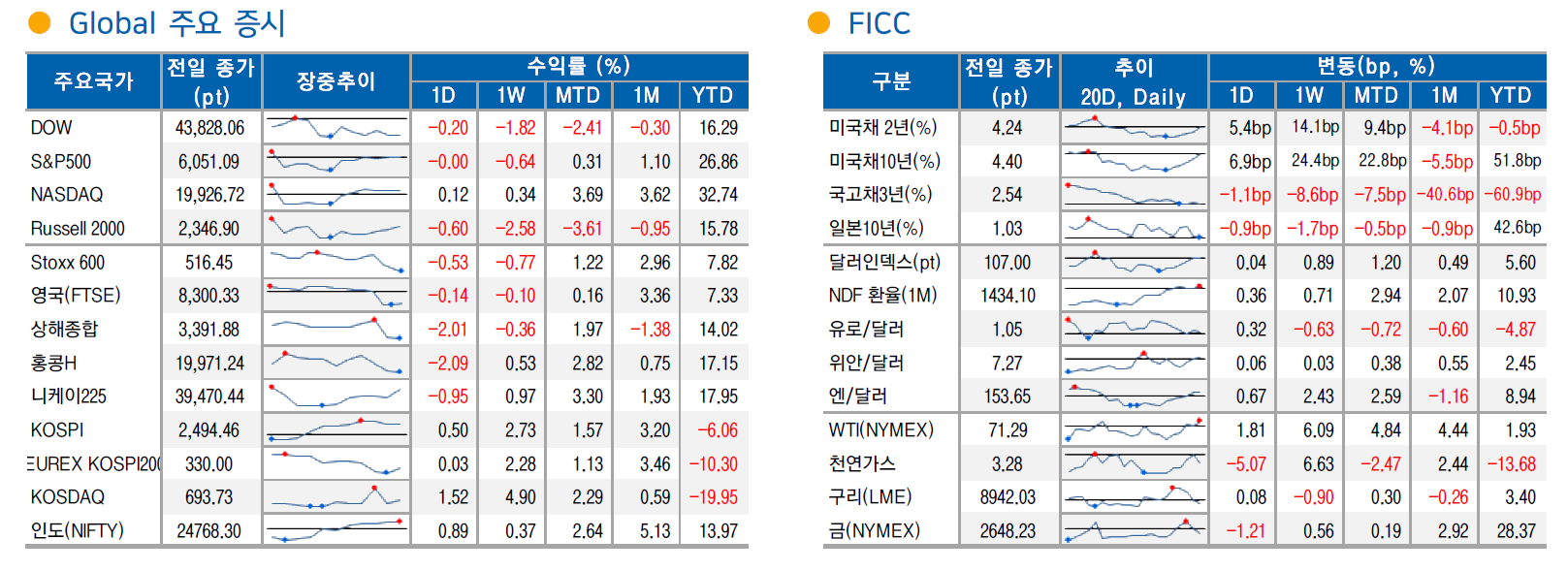 미 국채 금리는 2Y 4.24%(5.4bp), 10Y 4.4%(+6.9bp)로 장기물 중심의 상승. CME FedWatch 상 12 월 25bp 인하 확률은 96%애 육박하며 확실시 되는 양상이나 이후 확률상 ‘25 년에는 2 회(50bp)인하 정도가 예상되는 상황.달라인덱스는 106.98로 강세를 보였는데 예상보다 높은 인플레이션 데이터와 다음주 fomc에서 연준의 매파적인 정책 결정 가능성이 반영됨