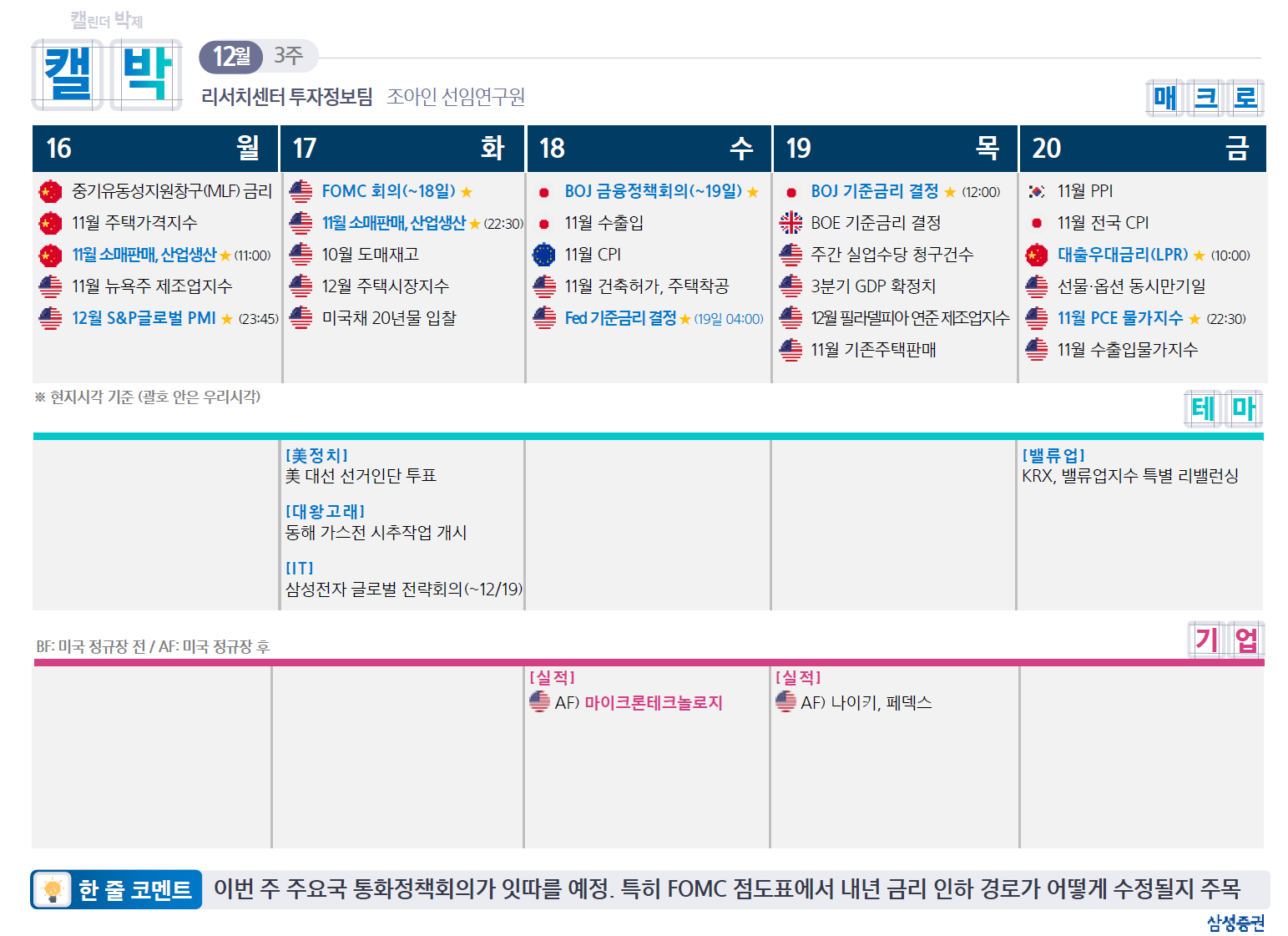애틀란타연방은행GDP, 애틀란타 연은의 GDP Now 는 지난 9 일 고용지표 등을 반영해 [4 분기 GDP 성장률을 연율 3.3%로 전망]. 현지기준 17 일 11 월 소매판매 데이터 발표와 함께 업데이트 될 예정. 12 월 FOMC 에서 25bp 인하는 확실시 되는 상황. 금리와 성장 경로에 대한 관심이 집중되는 가운데 FOMC 직전 성장률에 대한 힌트 확인 가능