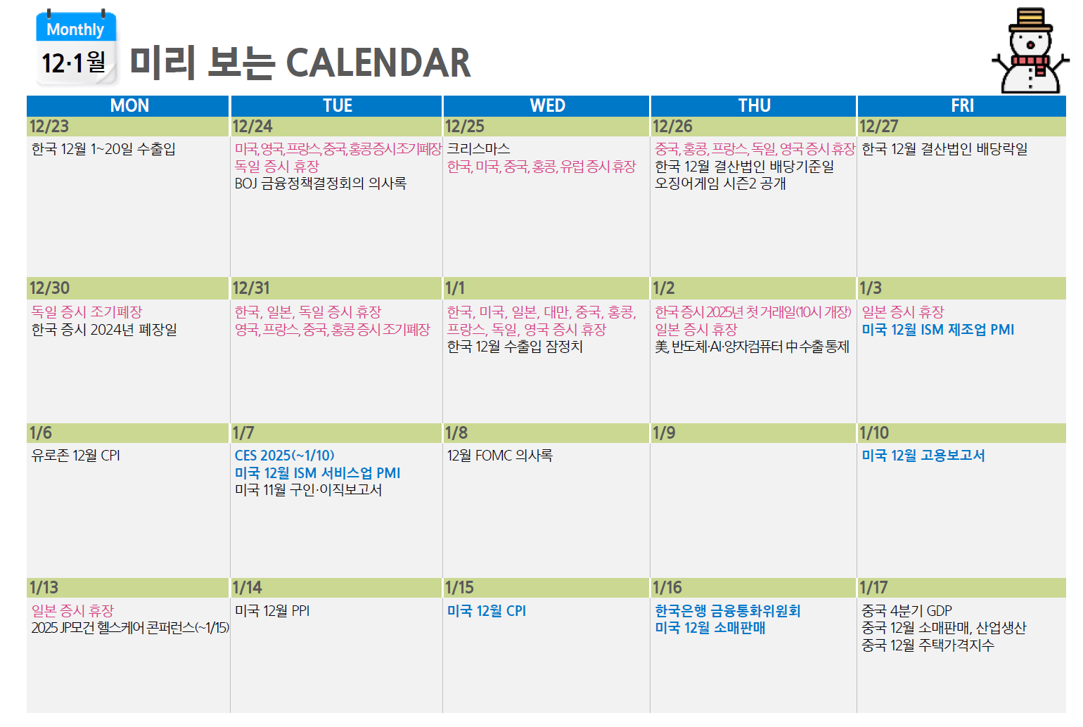 S&P500 종합 구매 관리자 지수, 12 월 S&P 글로벌 PMI 예비치는 종합 56.6pt, 제조업 48.3pt, 서비스업 58.5pt 로 컨센(55.1pt, 49.4pt, 55.7pt) 대비 종합과 서비스업은 상회, 제조업은 하회. S&P 측은 서비스업이 팬데믹 이후 가장 강력한 성장세를 보이고 있음을 강조하며 12 월 GDP 가 연율 3% 이상 상승하고 있다는 신호라 평가. 더해 차기 [트럼프 행정부의 친기업적 정책에 대한 기업들의 낙관을 강조]