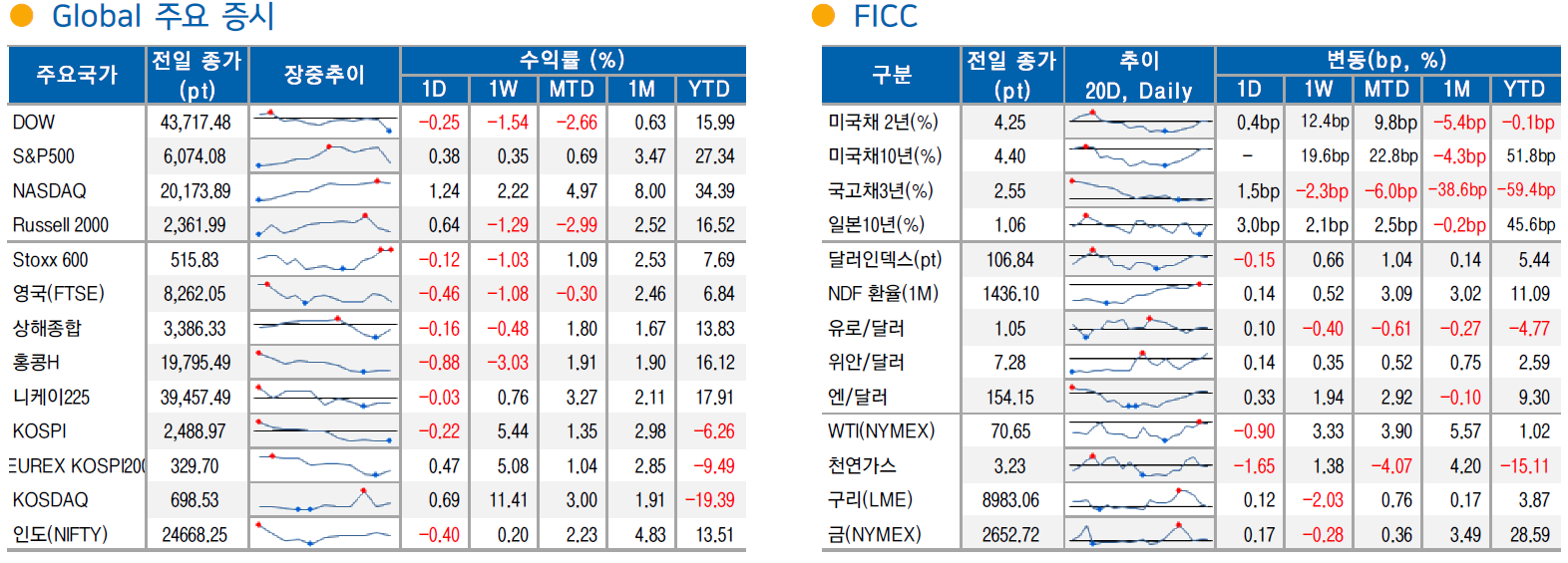 25bp 인하 기대감이 높은 상황임에도 중립금리에 대한 불확실성 잔존한 영향. 국채 금리 역시 제약적인 수준 유지. 다만 브로드컴(AVGO +11.2%), 테슬라(TSLA +6.1%), 알파벳(GOOGL +3.6%) 등 일부 대형 기술주들의 테마(엔비디아 대체, 트럼프, 양자)가 부각. 해당 종목들을 중심으로 종목장세 출현하며 [나스닥 신고가 갱신 다만 전반적 시장 센티는 부진한 모습]으로 S&P500 기업 중 321 개 기업이 하락.