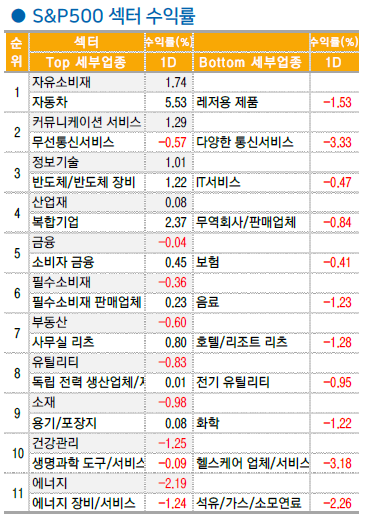 포드(F -3.9%)는 Jefferies가 투자의견 중립→매도, TP $12→$9로 하향 조정하자 주가 하락. 미국 내 강력한 판매 추세에도, 재고 과잉 문제가 지속되고 있음이 언급됨.