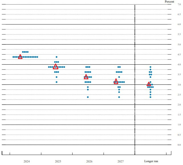 24년도 중간값은 9월 점도표대로 총 4회 인하로 마무리. 하지만 4명의 위원이 동결이 적절하다고 점을 찍었음. 이는 해먹 외 3명의 위원이 동결에 무게를 두었음을 시사