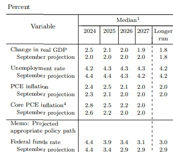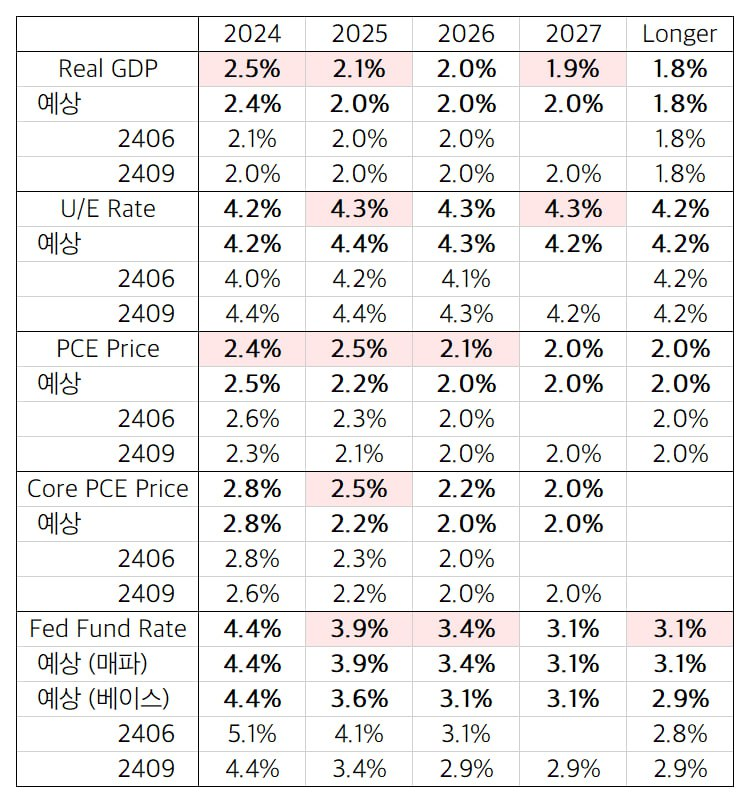2️⃣ 경제학자들은 내년에 경기 둔화를 예측했지만 정책입안자들은 2025년에 단 두 차례 인하를 전망 (대부분 이코노미스트들은 세 차례 인하를 예상). 인플레이션도 2027년 (9월에는 2026년)까지 2.0% 목표에 돌아오지 않을 것으로 예상