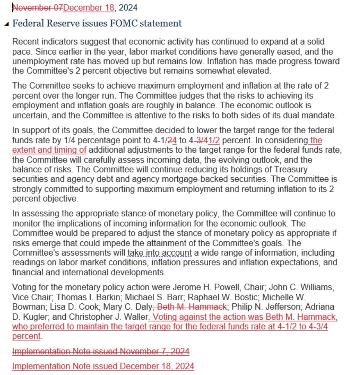 < 12월 FOMC 핵심 내용 정리 >1️⃣ 정책금리를 25bp 인하하면서 올해를 총 100bp 인하로 마무리. 파월은 이로써 연준의 정책 재조정이 완료되었고, 연준은 앞으로 더 신중하게 나아갈 것이라고 밝힘. 놀랍게도 올해 합류한 베스 해먹 클리블랜드 연은 총재는 동결 소수의견을 개진. 이는 2022년 6월 이후 첫 지역 연은 총재의 반대 의견 개진 사례