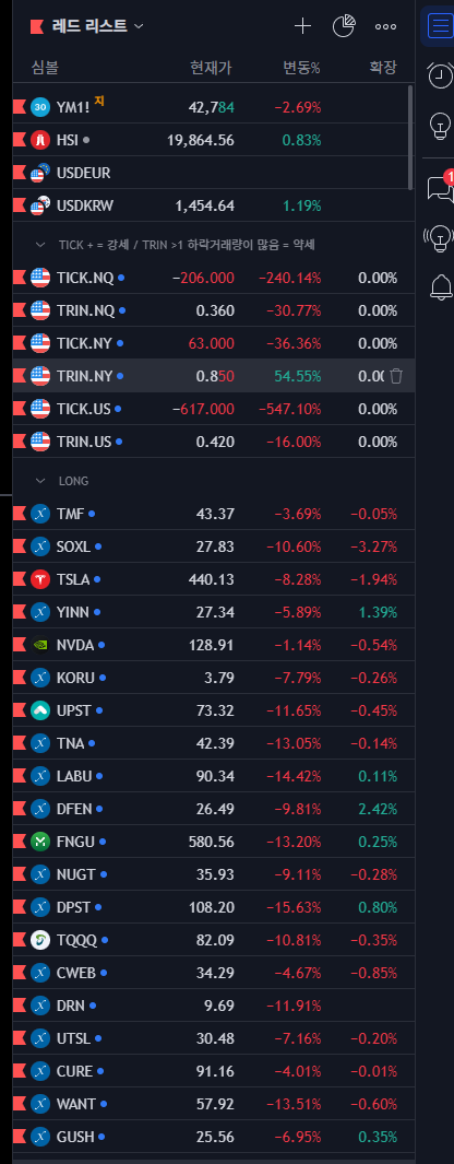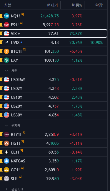 힛맵을 보면 그동안 많이 빠진 건강 보험 업종만 오늘 반등하며 초록색이고 나머지는 간만에 완전 불바다.CNN 공포와 탐욕 지수 공포 영역 진입. VIX 지수 74% 급등.