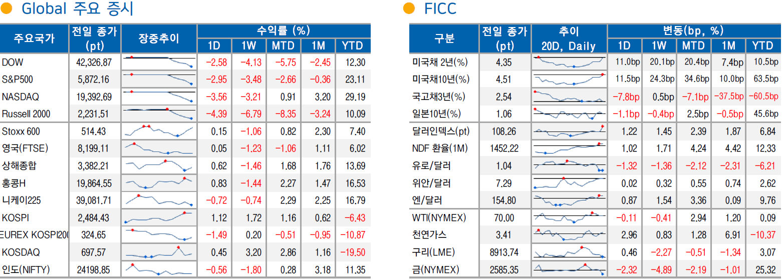 미 국채 금리는 2Y 4.35%(+11.0bp), 10Y 4.51%(+11.5bp)로 FOMC 결과 발표 이후 급등. 이와 함께 달러 인덱스도 상승하며 108.26pt 도달. 그간 25 년 연내 50bp 인하에 대한 베팅이 우세하던 CME FedWatch 는 현재 25 년 1 회(25bp) 인하 확률을 40%로 가장 높게 책정.