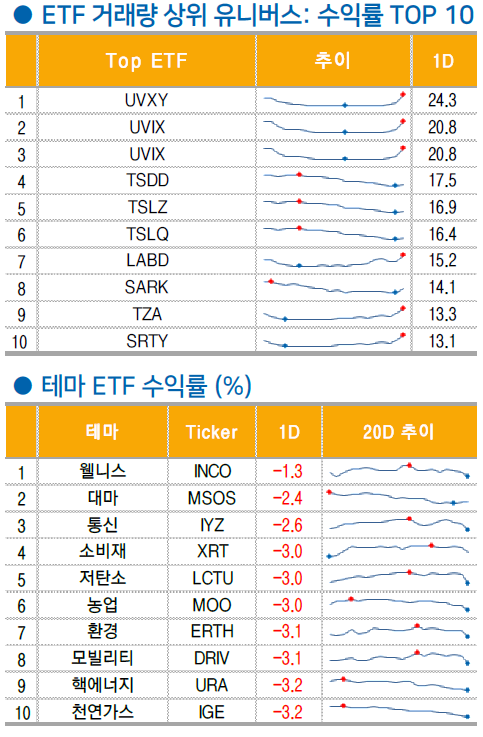 11 개 섹터 모두 하락 마감했으며 경기소비재, 부동산, 컴스, 금융, IT 가 가장 부진. 테슬라를 제외한 M7 업종들은 대체로 나스닥 지수의 낙폭과 유사한 수준. 그나마 애플(AAPL -2.1%)이 방어적인 모습 보였으며 엔비디아(NVDA -1.1%)는 최근 부진했던 탓에 하락폭 제한. 최근 랠리를 이어가던 브로드컴(AVGO -6.9%)은 이미 장중 하락세였으나 FOMC 이후 낙폭 확대
