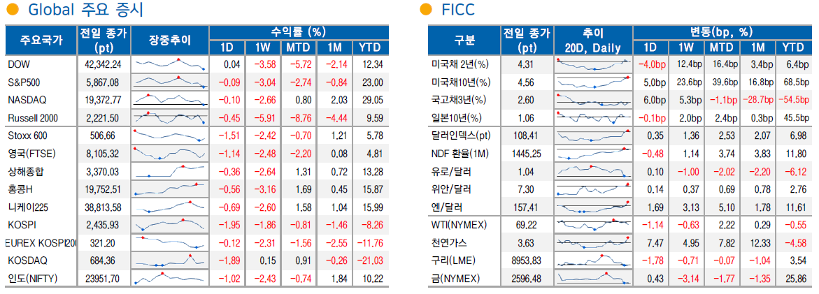 트럼프발 [미 정부 셧다운 우려]도 제약적으로 작용하는 모습장초반 전일 급락했던 반도체(-1.6%), 테슬라(TSLA -0.9%) 등 기술주 중심으로 반등을 시도했으나 [장중 상승폭을 확대한 장기물 금리에 하락 전환]. 반면 [금융과 소비재를 중심으로 DOW 구성 종목들은 비교적 견조]한 모습.