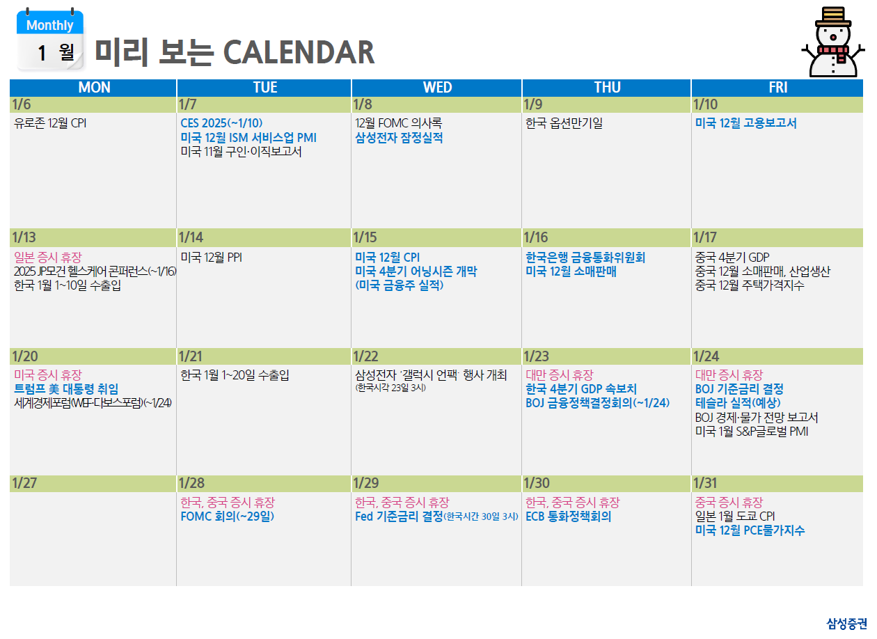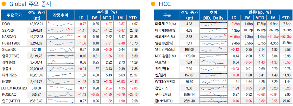 경기소비재(-1.9%), IT(-1.5%), 컴스(-1.1%), 금융(-0.8%) 등 24 년 상승세가 두드러졌던 업종 중심의 하락세미 국채 금리는 2Y 4.33%(-0.2bp), 10Y 4.63%(+4.3bp)로 장기물 중심의 상승. 12 월 FOMC 이후 4.6% 선 부근 등락을 이어가던 10Y 금리는 5 월 29 일 이후 처음으로 4.6%선 위에서 종가를 형성.