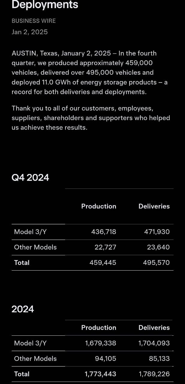 중국 시장의 연말 판매 호조에도 2025년 전망은 불확실한 상황이다.테슬라는 4분기에 495,570대의 차량을 인도했습니다. 월가는 ~507,000대를 예상했습니다. 4분기 총 생산량은 459,445대였습니다.